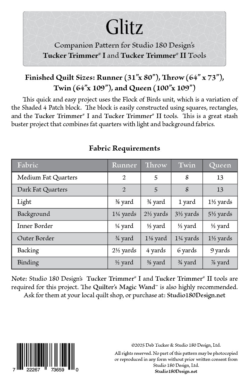 Looking for a quick and easy stash buster project? Glitz has you using our Flock of Birds technique (Technique Sheet not required), a nifty spin on the Shaded Four Patch, to create this fun project using only squares and rectangles! You'll be using your Tucker Trimmer® I and Tucker Trimmer® II tools for construction, making it accessible to quilters of all levels. Plus, it's fat quarter friendly, so it provides a perfect opportunity to highlight your favorite fat quarters!