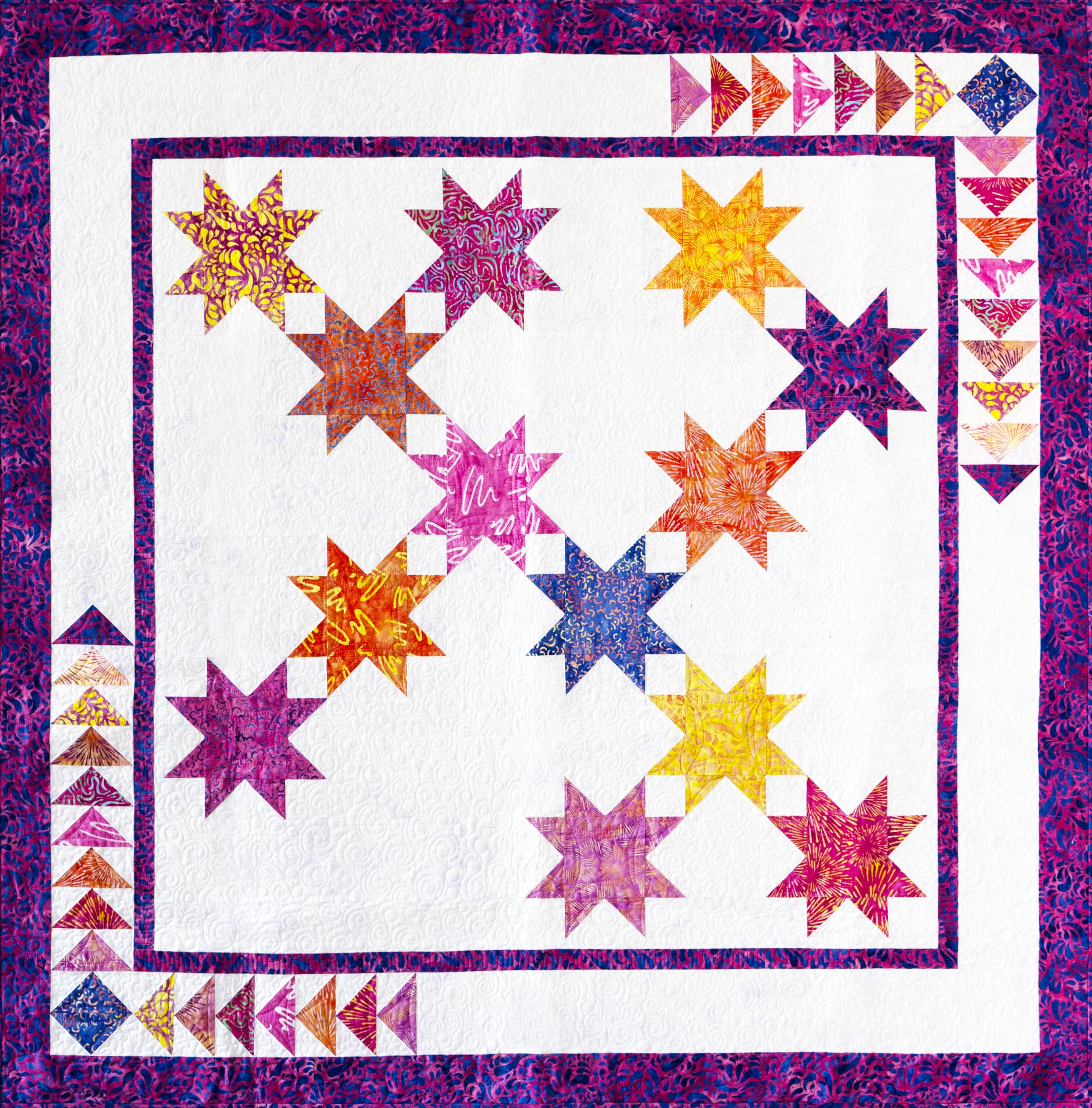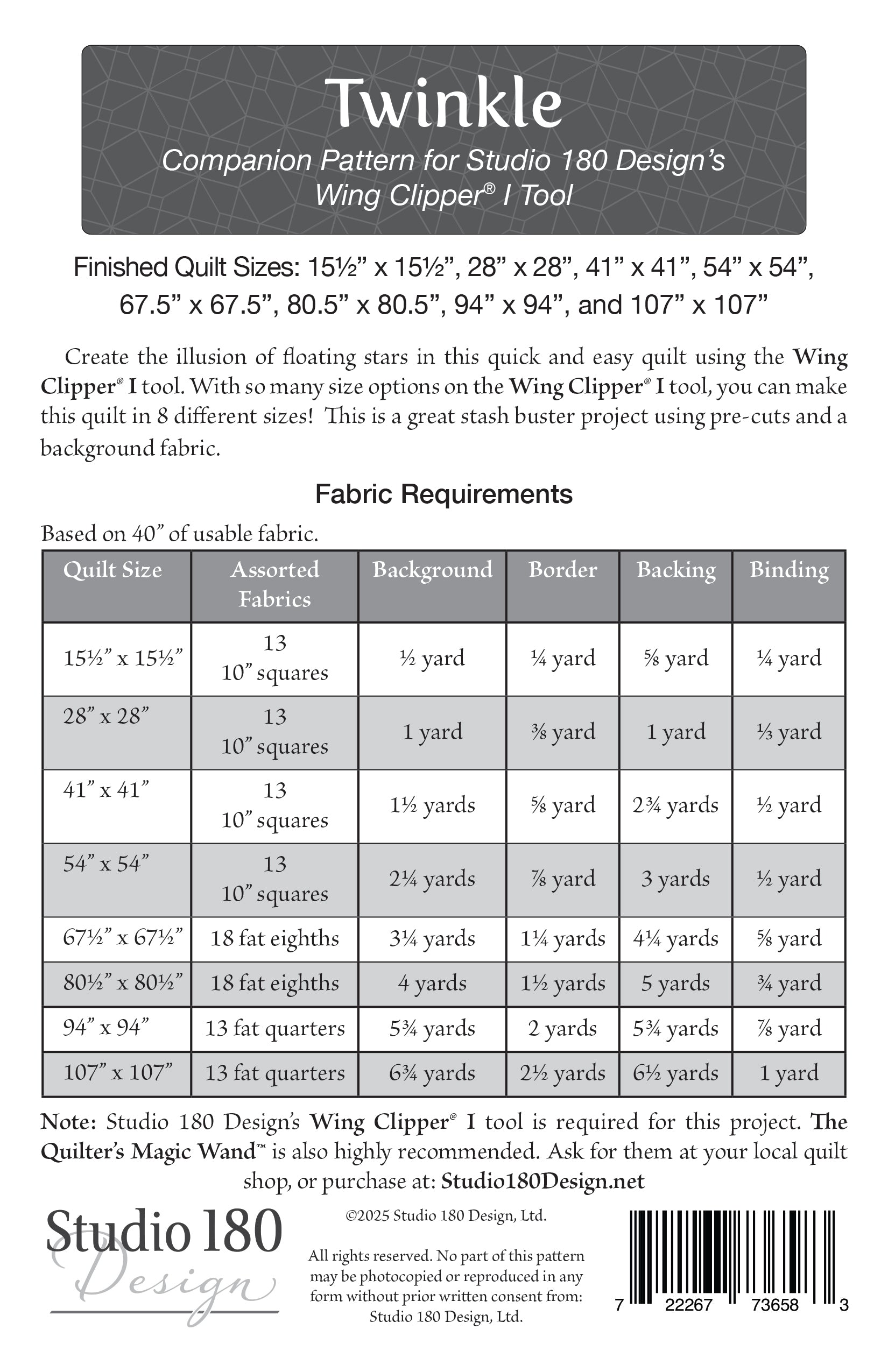 Create the illusion of floating stars in this quick and easy quilt using the Wing Clipper® I tool. With so many size options on your Wing Clipper® I tool, you can make this quilt in a whopping 8 different sizes! Twinkle is a great stash buster project using some pre-cuts and some of that extra background fabric. Pick some fun prints that contrast with your background to create a fun wall hanging or a quilt for your bed, whatever captures your imagination!